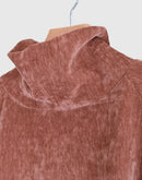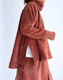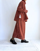 両面起毛でふんわり柔らかなベロア調ジャージーを使用したハイネックトップス。 滑らかな肌触りと上品な光沢感があり、ウールが苦手な方にも心地よく着用いただける一枚です。 厚みのあるオフタートルが首元をやさしく包み、 台形シルエットにフレアを効かせた身頃が美しいドレープを生み出します。 サイドスリットが抜け感を添え、ラグランスリーブと長めの袖口デザインがメリハリのあるシルエットに。 デイリーにも特別なお出かけにも、落ち着きある華やかさをプラス。 同素材の“YELL”スカート(LKL25WSK2049)とのセットアップスタイルもおすすめです。