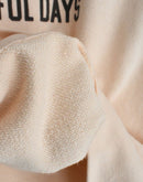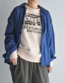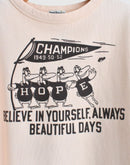 架空の “UNIVERSITY OF HOPE” アメフトチームの優勝記念スウェット、というユニークな設定で作られた1枚。 行進するキャラクターたちが H-O-P-E の文字を掲げ、ポジティブなメッセージ “Believe in yourself. Always beautiful days” がプリントされています。 柔らかな裏毛素材を使用し、ゆったりとしたドロップショルダーのシルエットで、リラックス感のある着心地。 カジュアルなデイリーコーデにぴったりで、アメリカンヴィンテージのムードを楽しめます。