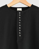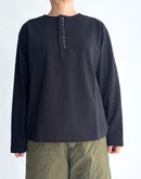 ナチュラルなムラ感が魅力のラフィ天竺を使用した、ヴィンテージテイストのロングスリーブTシャツ。 懐かしさを感じさせる10ボタンデザインを再現し、クラシックな雰囲気を漂わせます。 ゆとりある身幅でユニセックスに着られるデザインは、リラックス感とスタイルを両立。 シンプルながら存在感のある一枚で、デニムやチノなど幅広いコーディネートにマッチします。 日本製ならではの丁寧な仕立てと上質なコットン素材で、長く愛用いただけるアイテムです。日本製
