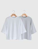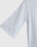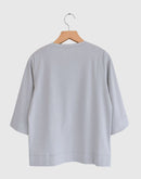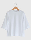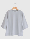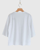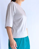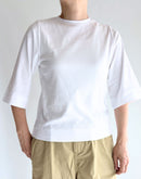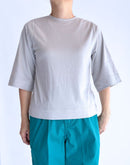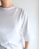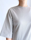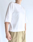 さらりとした肌触りのコットン100%素材で仕立てた「BERNINA 5分袖カットソー」。 程よい厚みの生地は一枚で着ても透けにくく、安心感があります。首元は詰まり過ぎないクルーネックで、顔まわりをすっきりと見せてくれます。 肘にかかる長さの5分袖は腕を華奢に見せつつ、気になる部分をさりげなくカバー。ゆとりのあるシルエットとすっきりとした着丈で、ボトムを選ばず合わせやすいのも魅力です。 ジャケットのインにも、一枚着としても活躍する、デイリーに頼れるベーシックな一着。日本製