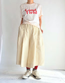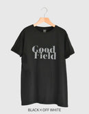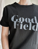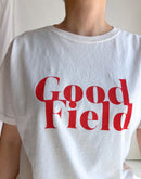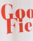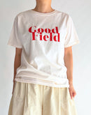 存在感のある“Good Field”ロゴを大胆にプリントした「DIAGONAL GFIELD Tシャツ」。 4.4ozのライトウェイトコットンを使用し、柔らかくさらりとした着心地が魅力です。製品染めによるナチュラルな色合いと風合いが、シンプルなTシャツに奥行きを与えています。 ややゆとりのあるシルエットでリラックス感があり、一枚での着こなしはもちろん、ジャケットやシャツのインナーとしても活躍。季節を問わず楽しめる万能なプリントTシャツです。made in U.S.A.