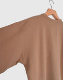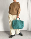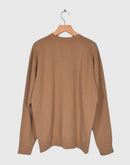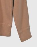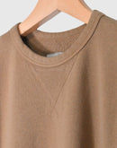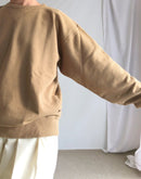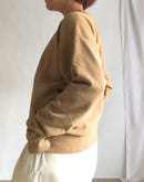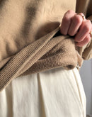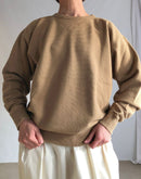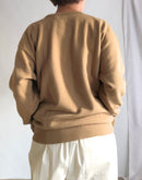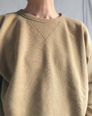 襟元はV字型に縫われたガゼット付きのオーセンティックなデザイン。 肩幅は少し広めですが、ルーズにはならなく程よくゆとりが残るシルエットです。 コットン100%の16GGで編まれた裏毛のスウェット生地は、柔らかな質感とサラッとしたドライな肌触りが魅力となっています。さらに製品染めで仕上げているので、ふんわりとした質感とヴィンテージのような深みのある色味が特徴です。