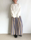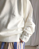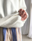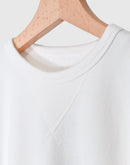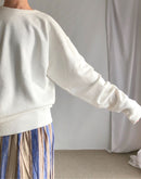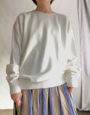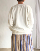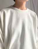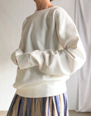 襟元はV字型に縫われたガゼット付きのオーセンティックなデザイン。 肩幅は少し広めですが、ルーズにはならなく程よくゆとりが残るシルエットです。 コットン100%の16GGで編まれた裏毛のスウェット生地は、柔らかな質感とサラッとしたドライな肌触りが魅力となっています。さらに製品染めで仕上げているので、ふんわりとした質感とヴィンテージのような深みのある色味が特徴です。
