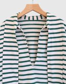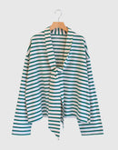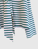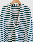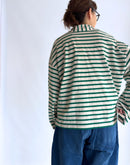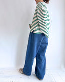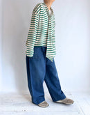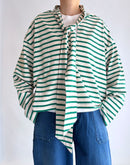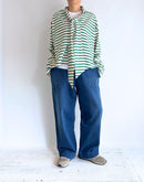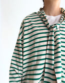 メキシコ産のタコスコットンを使い、先染めのボーダー柄を少し目を詰めて、丁寧に編み上げています。糸にはふっくらとしたふくらみがあり、やさしい風合いが魅力。ほどよい厚みとハリ感があるので、型くずれしにくく、きれいなシルエットをキープしてくれます。太めのタイは着回しのポイントとして、リボン結びでニットと合わせたり、ラフにほどいてジャケットを羽織ったりと着回しをお楽しみいただけます。日本製