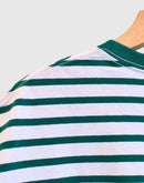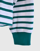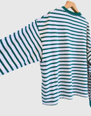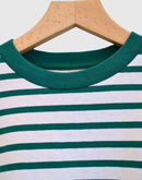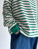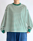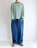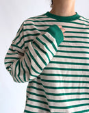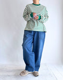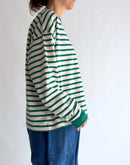 メキシコ産のタコスコットンを使い、先染めのボーダー柄を少し目を詰めて、丁寧に編み上げています。糸にはふっくらとしたふくらみがあり、やさしい風合いが魅力。ほどよい厚みとハリ感があるので、型くずれしにくく、きれいなシルエットをキープしてくれます。0.8×1.5ピッチの秋冬を感じる配色ボーダー生地に。1枚でも様になる肉感とインナーとしても重宝するサイズ感にこだわったアイテムです。日本製