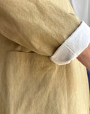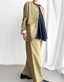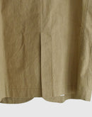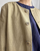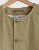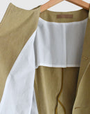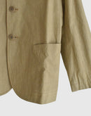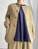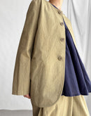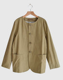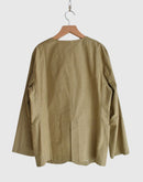 シンプルながらも存在感のあるノーカラージャケット。ダンプルーフ硫化染めによる奥行きのある風合いが魅力です。ほどよくゆったりとしたシルエットが、リラックス感を演出しながらも洗練された印象を与えます。大きめのボタンとラウンドカットの裾が、さりげないデザインポイントに。 生地にはダンプルーフ硫化染めトリプルWコットンを使用。ハリがありながらもしなやかで、軽やかな着心地が特徴です。程よい撥水性と耐久性を備えつつ、着込むほどに風合いが増し、経年変化を楽しめるのも魅力。硫化染め特有のムラ感が、こなれた雰囲気を演出します。 背ヨークと袖のみ裏地付きの仕立てで、季節の変わり目にぴったり。袖を折り返して異なる表情を楽しむのもおすすめです。カジュアルからきれいめまで、幅広いコーディネートに馴染む一枚です。日本製