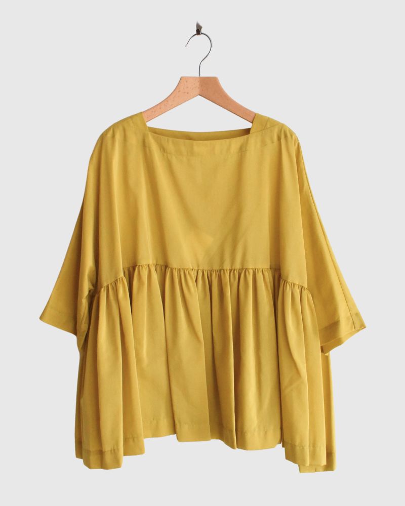 ふわりと軽いコットンシルクローンで仕立てたギャザーブラウス。切替には細かいギャザーをあしらい、裾が軽やかに広がる。ボートネックの襟は、スクエアにデザインされています。優しい透け感とシルクの光沢感が上品な1枚。日本製