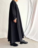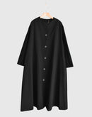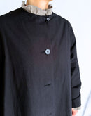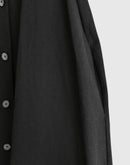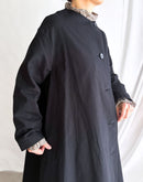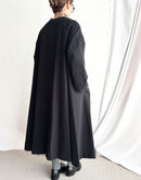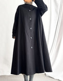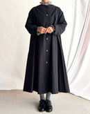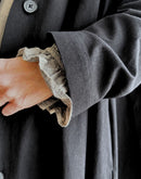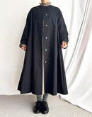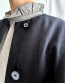 Aラインが美しいノーカラーコート。ボタンを全部留めてワンピースとして着るのも素敵な1着。スタイリング次第でカジュアルにもオケージョンにも対応できるコートです。和紙とコットンの混紡により、軽くて通気性がありながらも耐久性の高い生地を使用しております。ドライなタッチな仕上がりで和紙の質感を感じ、グログランの織りが独特の表情を生み出しています。日本製