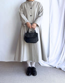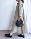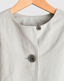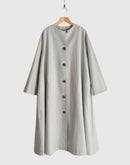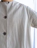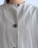 Aラインが美しいノーカラーコート。ボタンを全部留めてワンピースとして着るのも素敵な1着。スタイリング次第でカジュアルにもオケージョンにも対応できるコートです。和紙とコットンの混紡により、軽くて通気性がありながらも耐久性の高い生地を使用しております。ドライなタッチな仕上がりで和紙の質感を感じ、グログランの織りが独特の表情を生み出しています。日本製