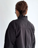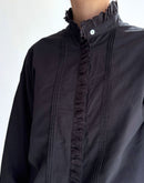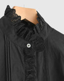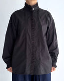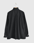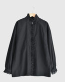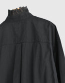 ヴィンテージレースブラウス : 新色ブラック 兵庫県 西脇市で、今では希少となったヴィンテージの力織機によってゆっくりと織り上げられた播州織コットンを使用。1日にわずかしか織れないこの生地は、効率よりも風合いを大切にした柔らかな質感が魅力です。洗うほどに空気を含むようにふわりと膨らみ、長く着るほど古着のように肌になじんでいきます。ヴィンテージクロスのブラックからインスピレーションでできた新色の BLACK。播州織特有のやわらかな凹凸感や表情が引き立ち、甘さを抑えたシックで凛とした印象に。首元・前立て・カフスに配したヴィンテージレースは、ブラックだからこそ甘くなりすぎず、かっこいいスタイリングになります。ゆったりとした袖まわりでリラックス感のあるシルエット。一枚ではもちろん、ジャケットやコート、ニットとのレイヤードにも映えるデザインです。ボタンの留め方や個数で襟元の表情をアレンジでき、袖をラフにまくっても様になります。着て、洗うほどに少しずつ表情を変えていくのも、BLACK ならではの魅力。雰囲気のある経年変化を楽しみながら、自分だけのヴィンテージ感を育てていただけます。季節を問わずお楽しみいただけるコットンブラウスです。日本製