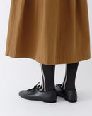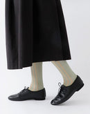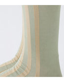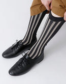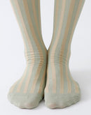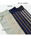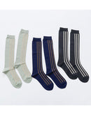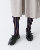 シンプルなストライプ柄のハイソックスです。ベースに毛羽の少ない細いスーピマ綿を使用し、薄く編み立てました。前側のみに入れたストライプと後側の無地部分とのコントラストがポイントです。タイツのようにスカートやワンピースに合わせても素敵で、スタイリングの幅が広がる1足です。