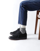 ウール糸で編み立てた程よい厚みのソックス。地平線をイメージした細ボーダーがポイント。ベーシックで合わせやすい1足。(防縮ウール仕様)