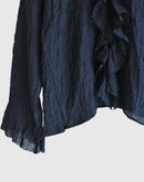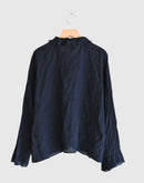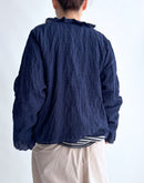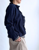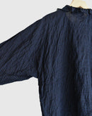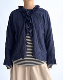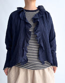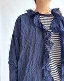 リネンコットン素材を使用した、軽やかで柔らかな風合いのチェックブラウス。 首元から前立て、袖口にかけてあしらわれたフリルが、さりげなく華やかさを添えます。 フリルの端はカットオフ仕様になっており、上品さの中に少しのラフさを感じさせるデザイン。 ナチュラルなシワ感があり、着るほどに風合いが増していきます。 ゆったりとしたシルエットで、インナーを合わせたレイヤードスタイルにも最適。 カジュアルにもフェミニンにも着こなせる、( g )らしい一枚です。日本製
