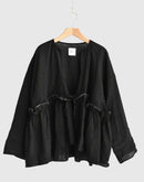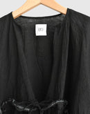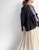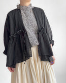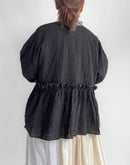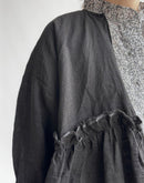 ふんわりと軽やかなリネン素材で仕立てた、リボン付きギャザーカバーオール。 ナチュラルなシワ感と、やさしい透け感が魅力の一枚です。 胸元から広がるギャザーが、立体的で柔らかなシルエットを演出。 フロントはリボンで軽やかに結ぶ仕様になっており、インナーとのレイヤードも楽しめます。 素材にはリネン100%を使用しており、通気性が良く、春夏の軽い羽織りとして活躍してくれます。 シンプルながらも、細やかなディテールが引き立つ一着です。日本製