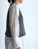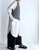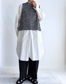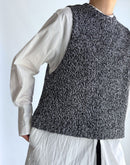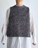 コットン100%の糸にギマ加工を施した、ローゲージのニットベストです。 ギマ加工とは、コットンに麻のようなさらりとしたドライな風合いを与える加工のこと。軽やかで清涼感のある肌触りで、暖かい季節にも心地よく着ていただけます。 ローゲージで編まれたほどよい透け感のある編地は、通気性がよく、見た目にも涼しげ。シャツやワンピースとのレイヤードに取り入れるだけで、装いに自然な表情と奥行きをプラスしてくれます。 ゆとりのある身幅と、バランスの取りやすいやや短めの着丈で、ワイドパンツやスカートとも好相性。シンプルながら、素材の質感が引き立つ一枚です。 季節の変わり目から夏まで、軽やかな重ね着を楽しめる、日常に寄り添うニットベストです。日本製