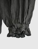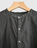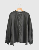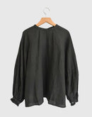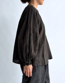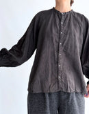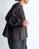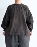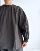 アトリエで絵筆を走らせるフランスの画家が纏うような一枚。 Gauze#の「アトリエ ブラウス」は、製品染めによってアンティークのような深い風合いをまとったリネン100%素材を使用しています。 前後どちらを前にしても着られる2wayデザインで、気分やスタイリングに合わせた着こなしを楽しめます。 ゆったりとしたシルエットに、ラグランスリーブと袖口のギャザーがほどよい抜け感を演出。シンプルながらも表情豊かなリネンの質感が、日常を特別なものに変えてくれるブラウスです。 職人の手仕事による風合いを楽しめる、永く愛用したいワードローブの一着。日本製