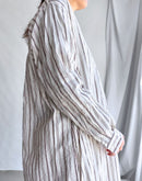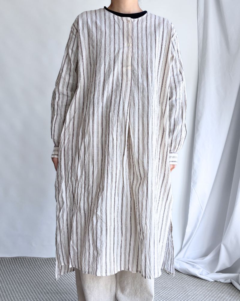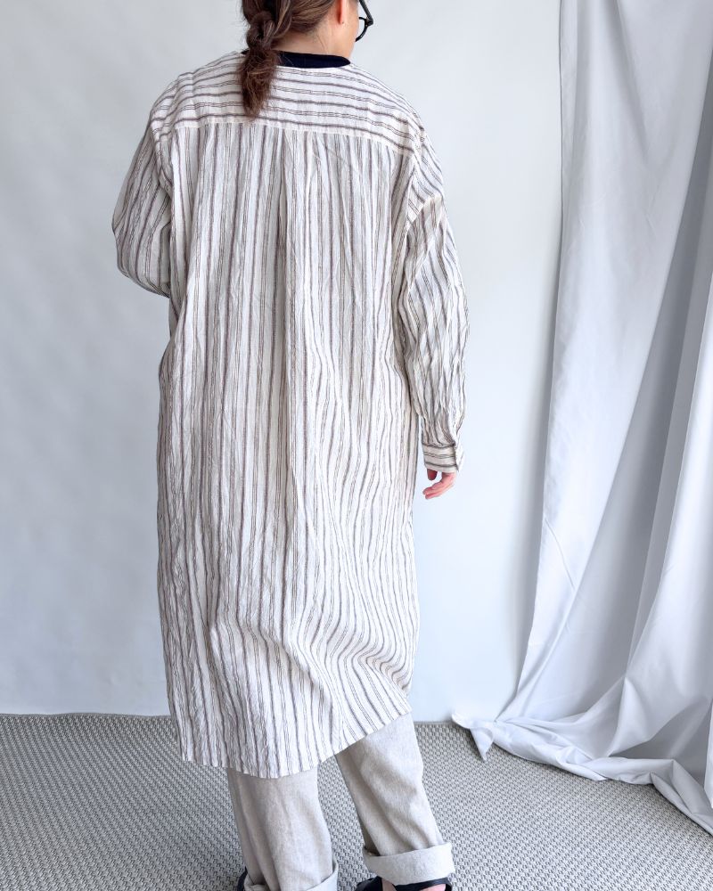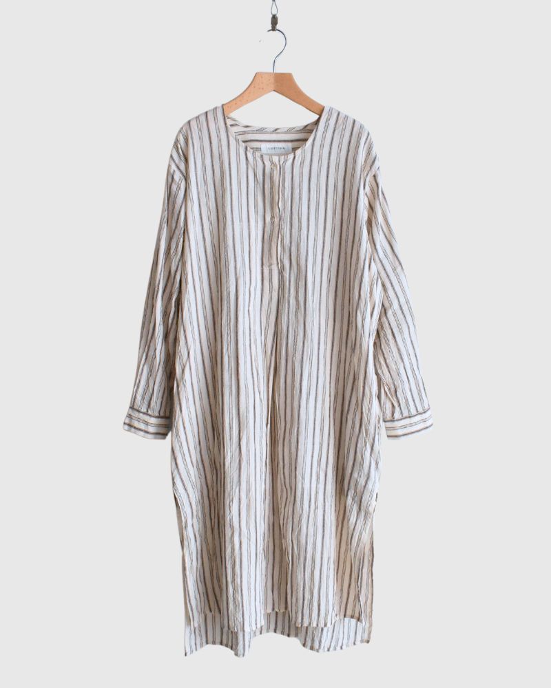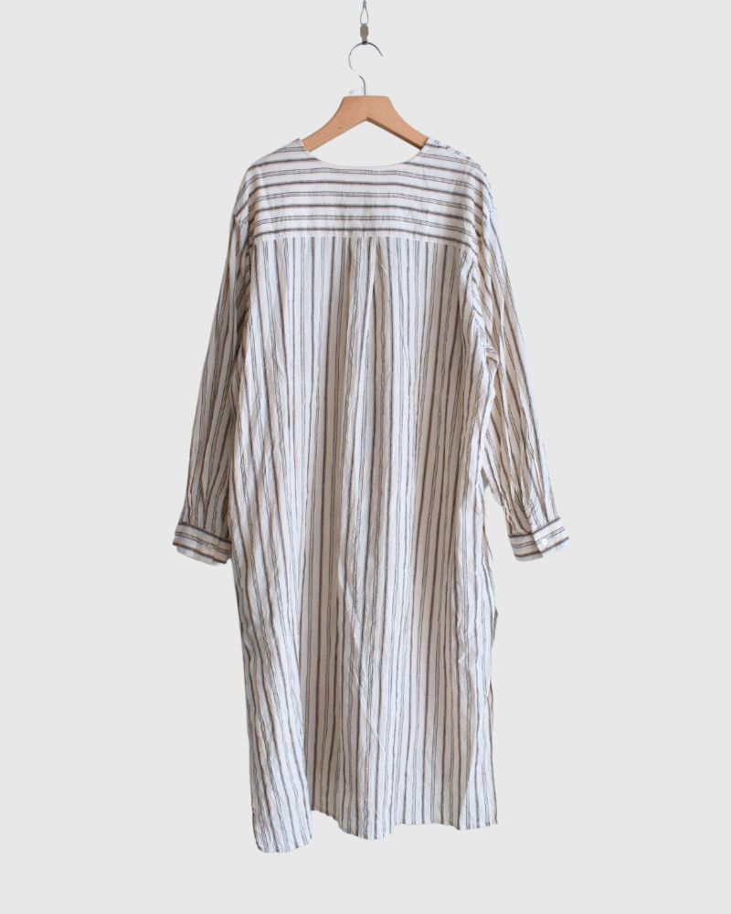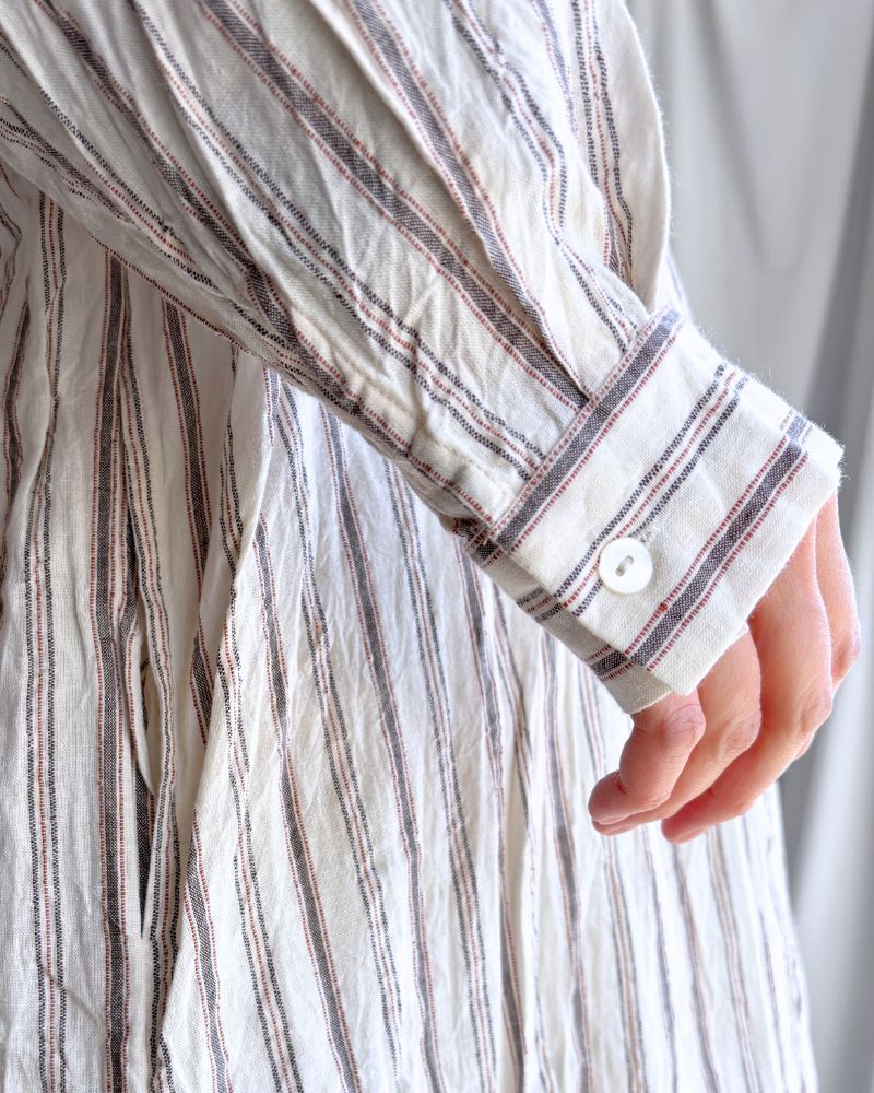 手織りされたオリジナルストライプのチュニックドレス。前あきは1つ釦で首元はすっきりとしています。デザインはシンプルに、脇のスリットを長めにとり、動き易くスリットから覗くボトムとのバランスが良いアイテムです。糸の番手を慎重に選んだオリジナルのストライプ生地は、肌に心地よく、そして印象的なマルチストライプがデザインしてあります。細ラインに数本の節のある太糸を使用し、綿糸の強弱と手織りの味わいで立体感のあるストライプ生地に。さらに製品洗いによりヴィンテージの雰囲気があります。江戸時代から弁柄縞と親しまれたBengal地方のストライプ生地を同じ織り方で織っています。その生地を減退の私たちが着用できる事はとても感動的です。インド製