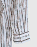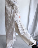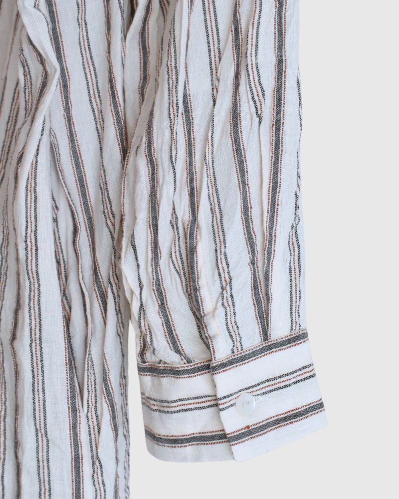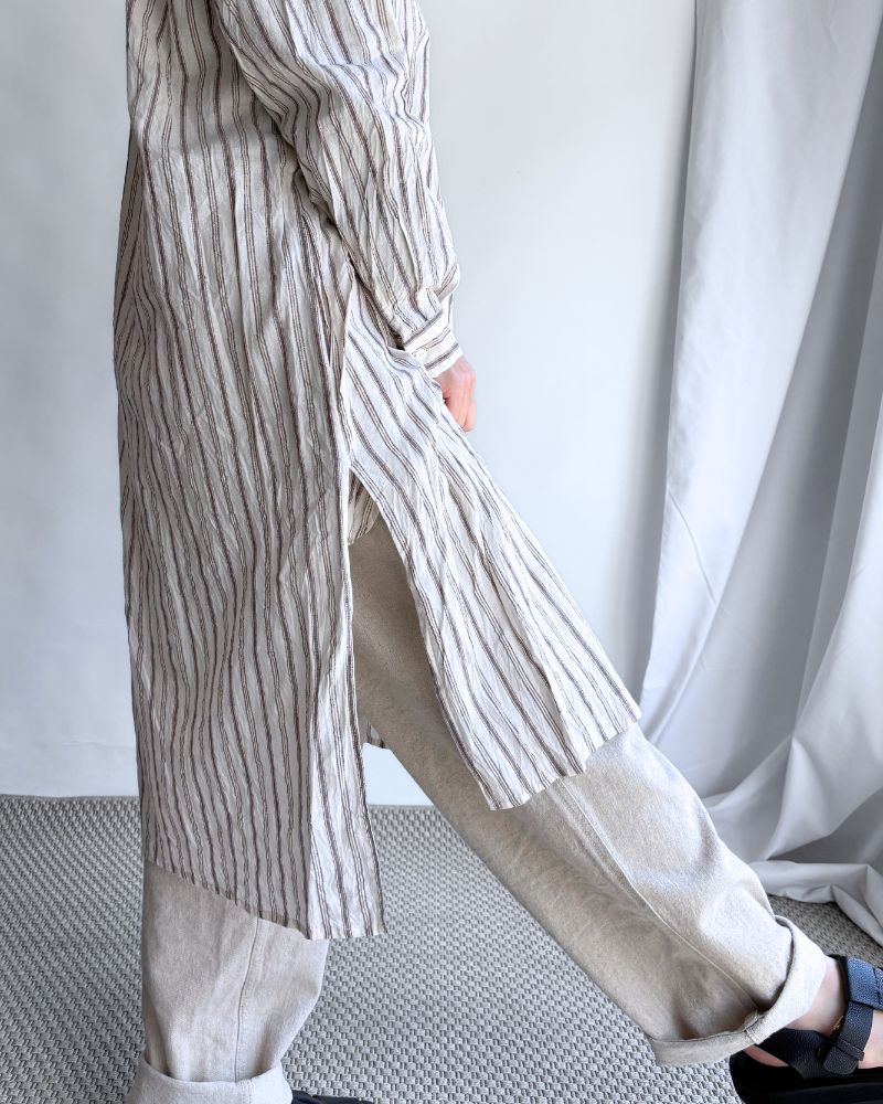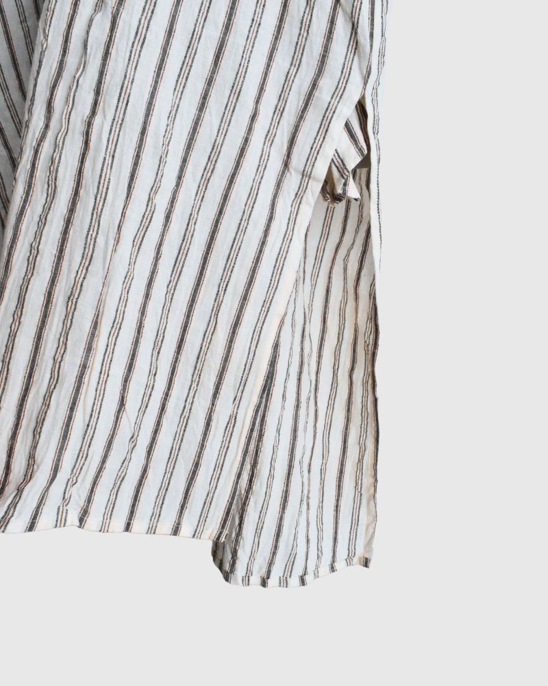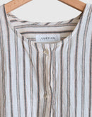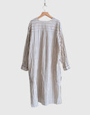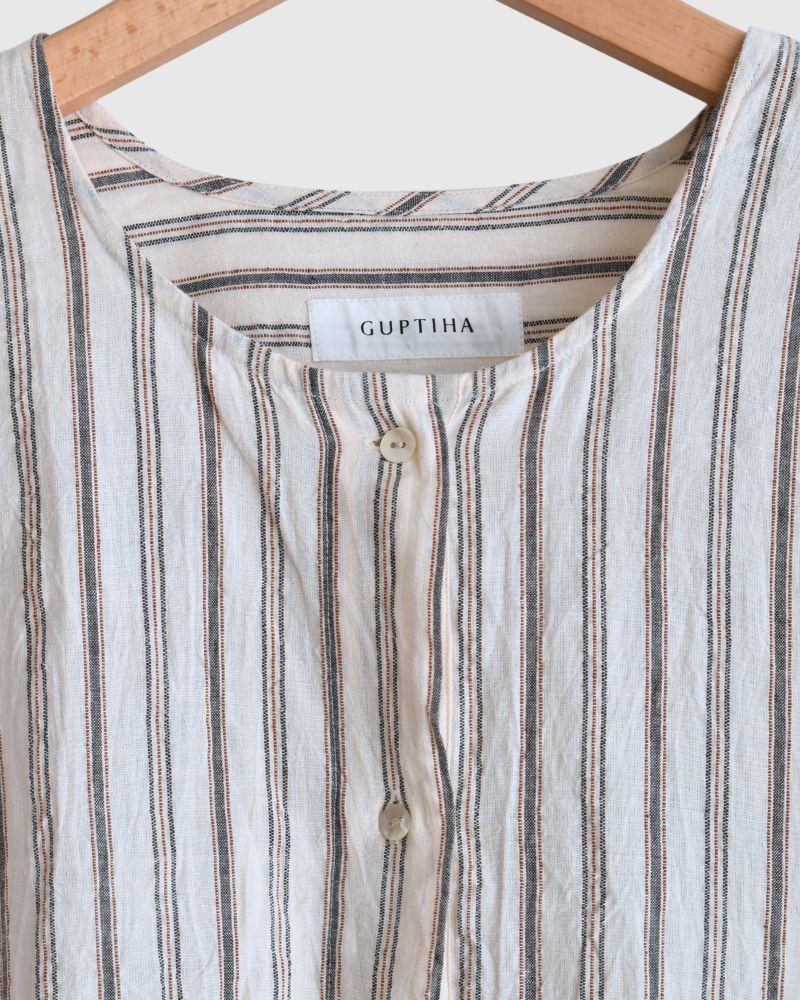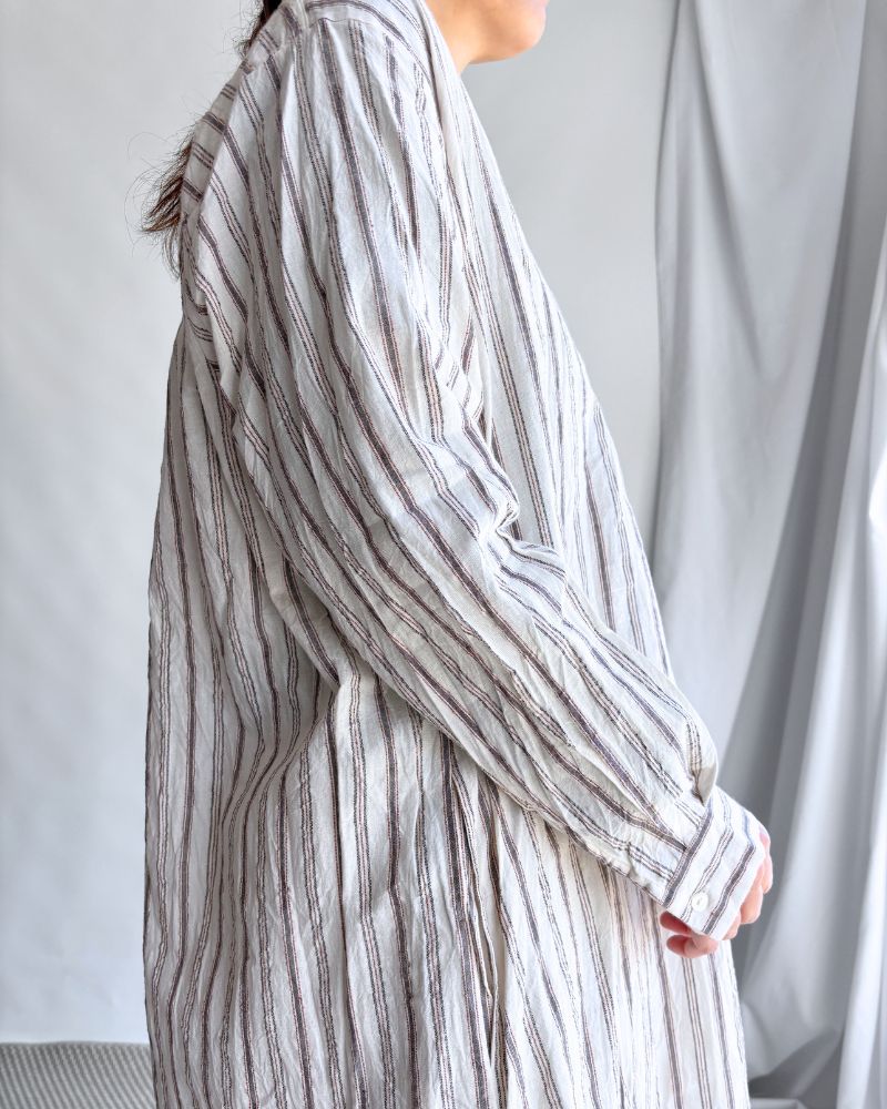 手織りされたオリジナルストライプのチュニックドレス。前あきは1つ釦で首元はすっきりとしています。デザインはシンプルに、脇のスリットを長めにとり、動き易くスリットから覗くボトムとのバランスが良いアイテムです。糸の番手を慎重に選んだオリジナルのストライプ生地は、肌に心地よく、そして印象的なマルチストライプがデザインしてあります。細ラインに数本の節のある太糸を使用し、綿糸の強弱と手織りの味わいで立体感のあるストライプ生地に。さらに製品洗いによりヴィンテージの雰囲気があります。江戸時代から弁柄縞と親しまれたBengal地方のストライプ生地を同じ織り方で織っています。その生地を減退の私たちが着用できる事はとても感動的です。インド製