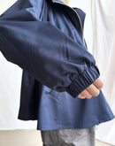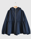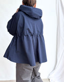 裾にかけて広がるシルエットのデザインフードジャケット。 前立てが立ち上がる立体的なフードまわりのデザインが特徴的。 ウエストは内側にドローコードで絞れる仕様でシルエットの変化が楽しめるポイント。 袖口にはゴムでギャザーを寄せたデザインで、たくしあげて着用が可能。 微光沢のポリエステル素材は取り扱いうやすく、デイリーに楽しめるZIPジャケットです。 同素材のスカートとセットアップにするとワンランク上のコーデをお楽しみいただけます。