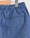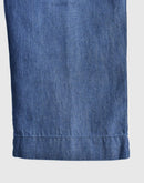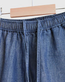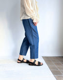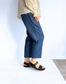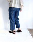 コットンリネンのデニム生地は、一般的なデニム素材よりは薄手で軽やかな履き心地ですが、しっかりとした打ち込みの生地なので、透け感はなく、丈夫なのが特徴。 バイオウォッシュ加工を施しているため、履き始めから少し履き慣らしたような柔らかな風合いを楽しめます。 ウエスト部分全体にはゴムが入っており、さらに内側から紐で調節が可能なイージーパンツ。 こちらは、ウエスト部分全体にはゴムが入っており、さらに内側から紐で調節が可能なイージーパンツ。 ヒップや太もも周りはゆったり、そして裾にかけて細くなるテーパードシルエット。 股下をやや短めに設定することで、足首周りで生地が弛まずスッキリと見えるので、足元に軽さを演出できます。日本製