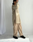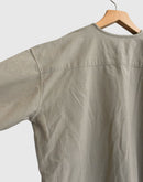 縦糸84コットン x 横糸56Khadi糸の先染め糸を使用し、ヴィンテージの織機で手織りされたヘビーコットン生地。 横糸が太いため、少しハリ感があるのが特徴です。 すっきりとしたネックラインのクルーネックシャツは、女性らしい印象を与えてくれるデザイン。 前身頃にはくるみボタンと無数の細かなピンタックが施され、上品な印象に。 全体的にゆったりとしたシルエットで着心地の良さもポイントです。インド製
