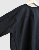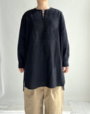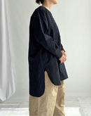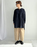 縦糸84コットン x 横糸56Khadi糸の先染め糸を使用し、ヴィンテージの織機で手織りされたヘビーコットン生地。 横糸が太いため、少しハリ感があるのが特徴です。 すっきりとしたネックラインのクルーネックシャツは、女性らしい印象を与えてくれるデザイン。 前身頃にはくるみボタンと無数の細かなピンタックが施され、上品な印象に。 全体的にゆったりとしたシルエットで着心地の良さもポイントです。インド製