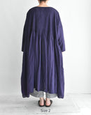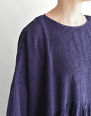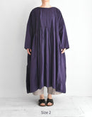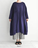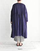 オーガニックコットン100%の、薄手で軽やかな素材を使用したプルオーバードレスです。細かなマイクロチェックの織りによるさりげない凹凸感と、オーバーダイによる深みのある色合いが、素材に豊かな表情を与えています。 前後の身頃には繊細なピンタックを贅沢に施し、中央とサイドで幅に変化をつけることで、動きのある美しい立体感に。ゆったりとした身幅と、タックから広がるギャザーが、リラックスした着心地とやわらかな存在感を生み出します。 一枚で軽やかに着るのはもちろん、パンツとのレイヤードも楽しめる、表情豊かな一着です。 インド製