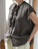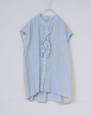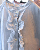 上質なフレンチリネンを使用した、軽やかなフリルブラウス。 フロントにあしらわれたラフなフリルが、甘すぎず、さりげなく女性らしい印象を添えます。 首元はすっきりとしたバンドカラーで、きちんと感のあるデザイン。 風通しの良いリネン素材は、初夏から秋口まで快適に着られ、 カジュアルにも上品にも活躍する一枚です。 軽やかに揺れるシルエットが、日常に心地よい抜け感をもたらします。 Made in Japan