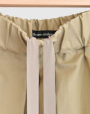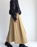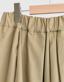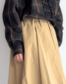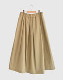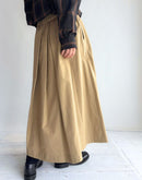 柔らかなツイル生地を贅沢に使い、たっぷりとしたタックで立体感を出したフレアスカート。 ウエストは総ゴム仕様で、ドローコードによるサイズ調整も可能。 動くたびにふわりと揺れるシルエットが、女性らしい上品さとリラックス感を演出します。 両サイドには便利なポケット付き。 シンプルながらも存在感のある一着で、カジュアルからきれいめまで幅広く活躍します。