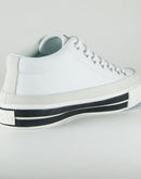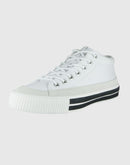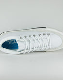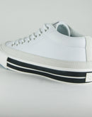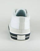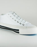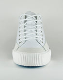 RFWを代表するモデルの一つBAGEL-MIDから初期に製作したキャンバス&スエードのモデル「STD」をアップデートさせました。BAGELの特徴であるミッドカットスニーカーはくるぶし丈で履き口がすっきりと作られており、シューレースを締めると足全体を優しくホールドしてくれます。履き口周りにはパッドが入っているので、フィット感は抜群です。またソールに配置した2本の太い黒いラインもポイントです。アウトソールはRFWのブランドカラーのシアンブルー(水色)になります。クッション性のあるPUインジェクションのカップインソールが足への負担を軽減し、快適な歩行をサポートします。アウトソールはしなやかながら耐久性の高いラバーソールになります。キャンバスのオフホワイトの清潔な色合いは、シーンを問わず幅広くコーディネートできるのが特徴です。カジュアルなパンツスタイルからきれいめなスカートスタイルまで、様々な着こなしに合わせることができます。