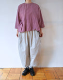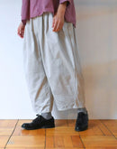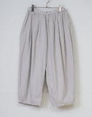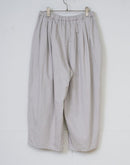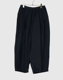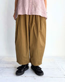 ブランド定番の《カミーユタックパンツ》。 今季はムラ糸で織り上げたバックサテン素材を使用し、 さりげない光沢と程よいハリ感が魅力です。 ウエストは総ゴム仕様でリラックス感がありながら、 タックの立体的なラインがマニッシュな印象を引き立てます。 シーズンを問わず着まわせるデイリーワードローブとして活躍する一枚。 Made in Japan