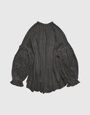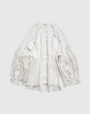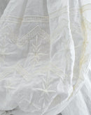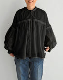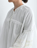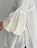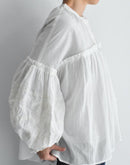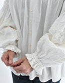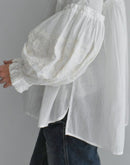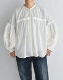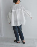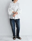 薄手で軽やかなコットンボイル素材を使用した、tsukinowaのときめきseriesブラウス。 空気を含んだような柔らかな生地感と、肌にそっと寄り添う軽やかな着心地が魅力です。 袖部分には、インドの職人による繊細な手刺繍を施し、 さりげない華やかさと温もりのある表情を添えています。 ギャザーをたっぷりと入れたボリュームスリーブは、甘くなりすぎず、大人の装いに自然になじむデザイン。 身頃はゆとりのあるシルエットで、風をはらむような軽やかさ。 透け感のある素材のため、インナーとのレイヤードを楽しみながら、季節感のあるスタイリングが可能です。 袖口はゴム仕様で、たくし上げて着用するのもおすすめ。 デニムやワイドパンツと合わせて、抜け感のある大人のカジュアルスタイルに。インド製