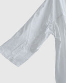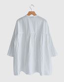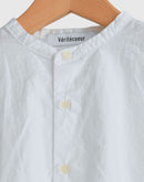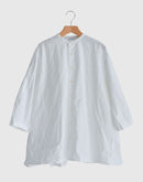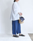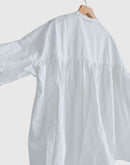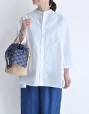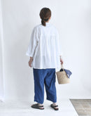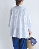Cotton 100%のさらりとした薄手のタイプライター生地を使用したシャツです。風合い豊かな心地よい生地感です。前身頃はシャツスリーブ、後身頃はギャザーの入ったヨークスリーブ。前から見るとシャツ、後ろから見るとチュニックのようなデザインです。袖は七分袖でスッキリとした印象に。前ボタンですので、軽めの羽織物としても着て頂けます。製品染めをし、風合い良く仕上げています。日本製