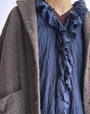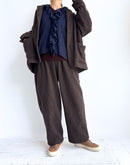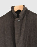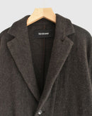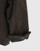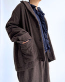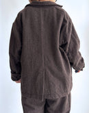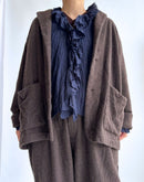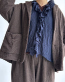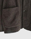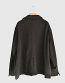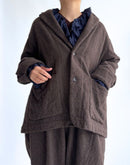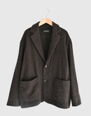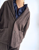 縮絨加工とタンブラー加工を施したフラノ生地を使用した、柔らかく温もりのある風合いのテーラードジャケット。 ウールにナイロンを少量混紡することで、軽やかさと耐久性を兼ね備えた仕上がりになっています。 一枚仕立てで仕上げた軽やかな着心地が魅力。 深めのVゾーンに2つボタンを配したデザインは、ラフな中にも上品な印象を与えてくれます。 ラペル裏にはボタンが付いており、衿を立てての着用も可能。シーンや気分に合わせて表情の変化を楽しめます。 ゆったりとした身幅とドロップショルダーのリラックスシルエットで、 同素材のタックパンツ(VC-2798)とのセットアップスタイルもおすすめ。 軽やかで上質な冬の装いを演出する一着です。日本製