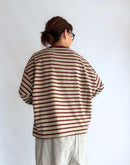 メキシコ産のタコスコットンを使い、先染めのボーダー柄を少し目を詰めて、丁寧に編み上げています。糸にはふっくらとしたふくらみがあり、やさしい風合いが魅力。ほどよい厚みとハリ感があるので、型くずれしにくく、きれいなシルエットをキープしてくれます。0.8×1.5ピッチの秋冬を感じる配色ボーダー生地に。1枚でも様になる肉感とインナーとしても重宝するサイズ感にこだわったアイテムです。日本製