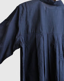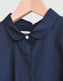 前身ごろはシンプルに、襟・袖・後ろ裾に刺繍をあしらった生地を合わせた上品な1枚。小さな丸襟と比翼仕立ての前立てでスッキリとした印象です。背中のプリーツが美しく、バックスタイルのポイントになります。