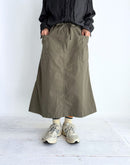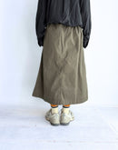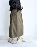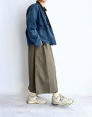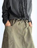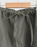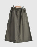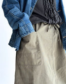 裾幅とウエストを大きくとった、 ゆったりとしたストレートシルエットのイージースカート。 素材には、コットン100%のヘリンボーン生地を使用。 洗いをかけた生地は、程よくやわらかく、 ナチュラルな表情と落ち着いた風合いが特徴です。 ウエストはゴムを使用しない仕様で、 共紐を絞ることで自然なギャザーが生まれ、 ほどよいボリューム感のあるシルエットに。 締め付けがなく、リラックスした穿き心地を感じられます。 トップスをインしてもアウトでもバランスが取りやすく、 日常使いしやすい一枚。 季節を問わず、着こなしに取り入れやすいスカートです。 インド製